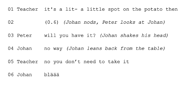 What happens in this mealtime is a similarly delayed response from the child who has, for at least a minute, been considering what this mark on the potato might be. Had the disgust been purely about an individual visceral response to the object then we might have expected Johan – or Peter – to produce this much earlier on. Instead, it is only when Peter and then the teacher raise the issue of whether or not Johan will have or take the potato, that the disgust sound emerges. In other words, it occurs when there is mention that the potato might end up on his plate rather than when it is being discussed as something he has noticed.