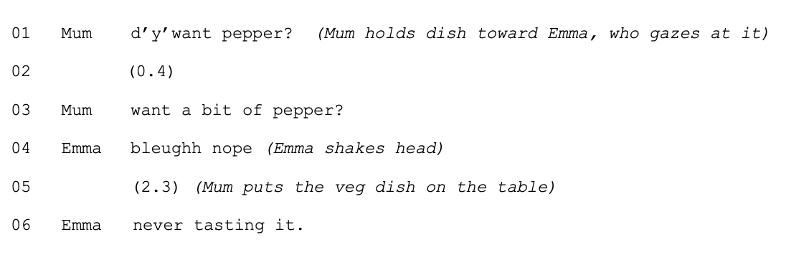 If we look at the talk in a bit more detail, we might notice that Mum’s offer of the food is produced twice (on lines 01 and 03). The “(0.4)” on line 02 represents four-tenths of a second of silence in which neither Mum nor Emma say anything. That might seem miniscule, but it is enough to warrant a repetition of the offer with a slight caveat: there’s a tiny downgrade from ‘pepper’ to ‘a bit of pepper’. Perhaps Mum knows that Emma is about to decline the offer and reduces the threshold to make it easier for her to say yes. Emma is, after all, already gazing at the food.